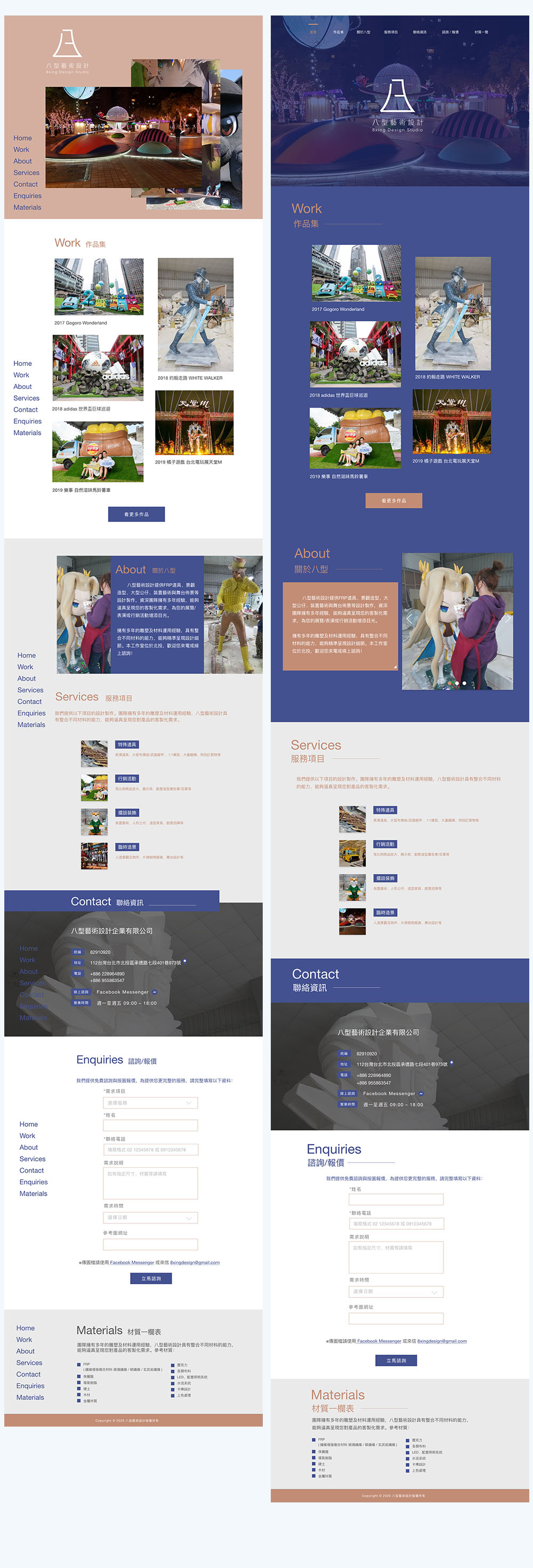 同時也包含八型藝術設計公司的官網設計,由於業主希望後續能自行經營,所以規畫好視覺後使用WIX來編輯頁面,讓業主在後續編輯上無須透過複雜的code也能修改文案和上傳新的作品。